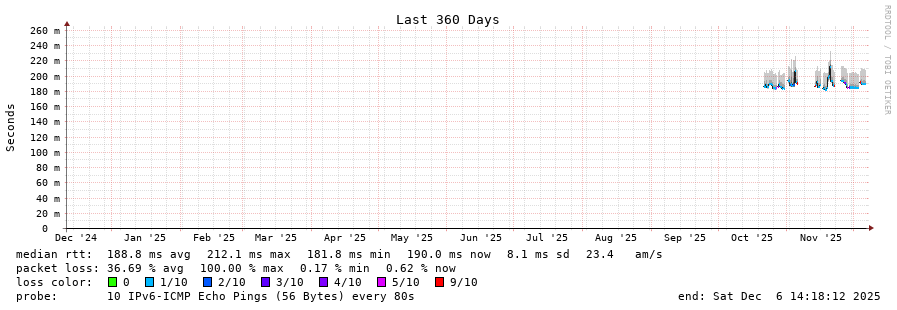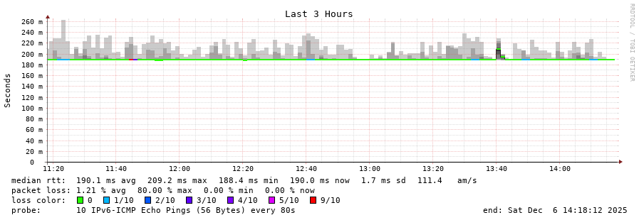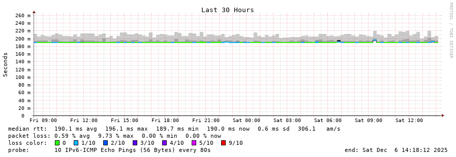 traceroute to 2001:470:1f13:814:1ad6:c7ff:fe2a:502 (2001:470:1f13:814:1ad6:c7ff:fe2a:502), 30 hops max, 80 byte packets - Generated at 2025-12-06 14:00:01