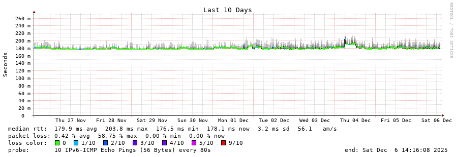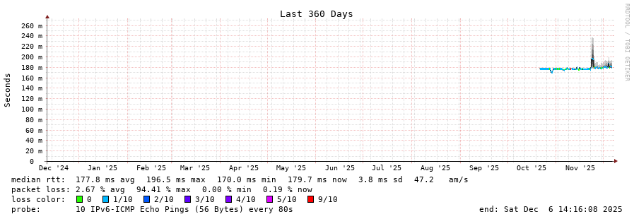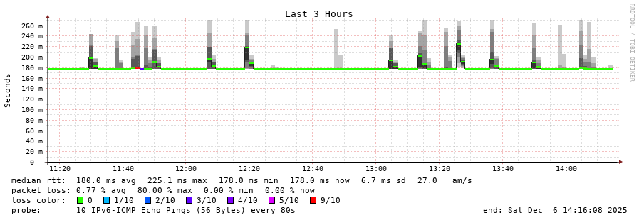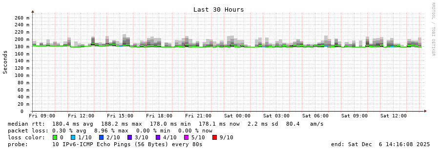 traceroute to 2a0c:9a40:8610:e3f::1 (2a0c:9a40:8610:e3f::1), 30 hops max, 80 byte packets - Generated at 2025-12-06 14:00:01