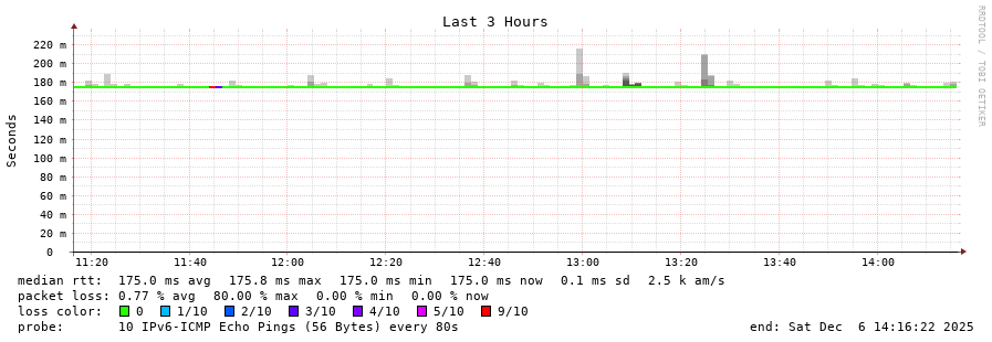 traceroute to 2001:67c:1e0:0:c225:e9ff:fea8:6a0a (2001:67c:1e0:0:c225:e9ff:fea8:6a0a), 30 hops max, 80 byte packets - Generated at 2025-12-06 14:00:01
