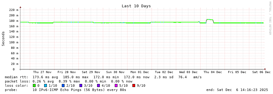 14 > 2001:ac8:10:10::d185 (2001:ac8:10:10::d185) [AS9009] 172.300ms 172.162ms 172.189ms