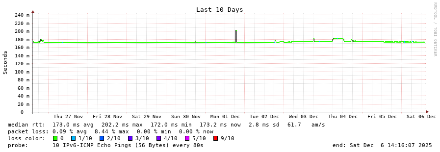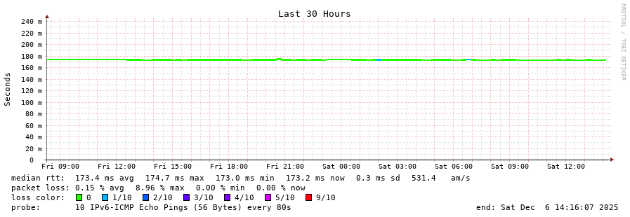 15 > 2001:730:2601:f005::2 (2001:730:2601:f005::2) [AS6830] 173.228ms 173.217ms 173.248ms